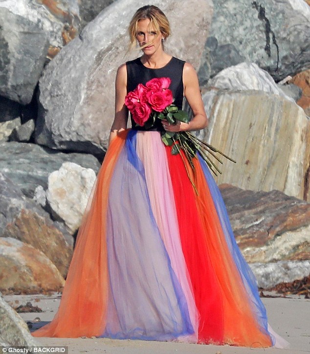 Джулия Робертс была замечена позирующей в ярком платье на пляже в Малибу в пятницу утром.