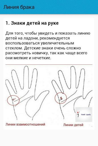 Детская линия бывает двух вариантов, как длинной, так и короткой. Обычно короткая линия рассказывает о том, что женщина станет мамой дочки, а длинная — что мамой сыночка. Отходят линии любви снизу вверх, поэтому первой нужно считать нижнюю линию. Нижняя граница отмечена линией сердца, а верхняя заканчивается на основании мизинца. По линии брака или любви легко понять, от каких именно отношений по счету родятся дети.