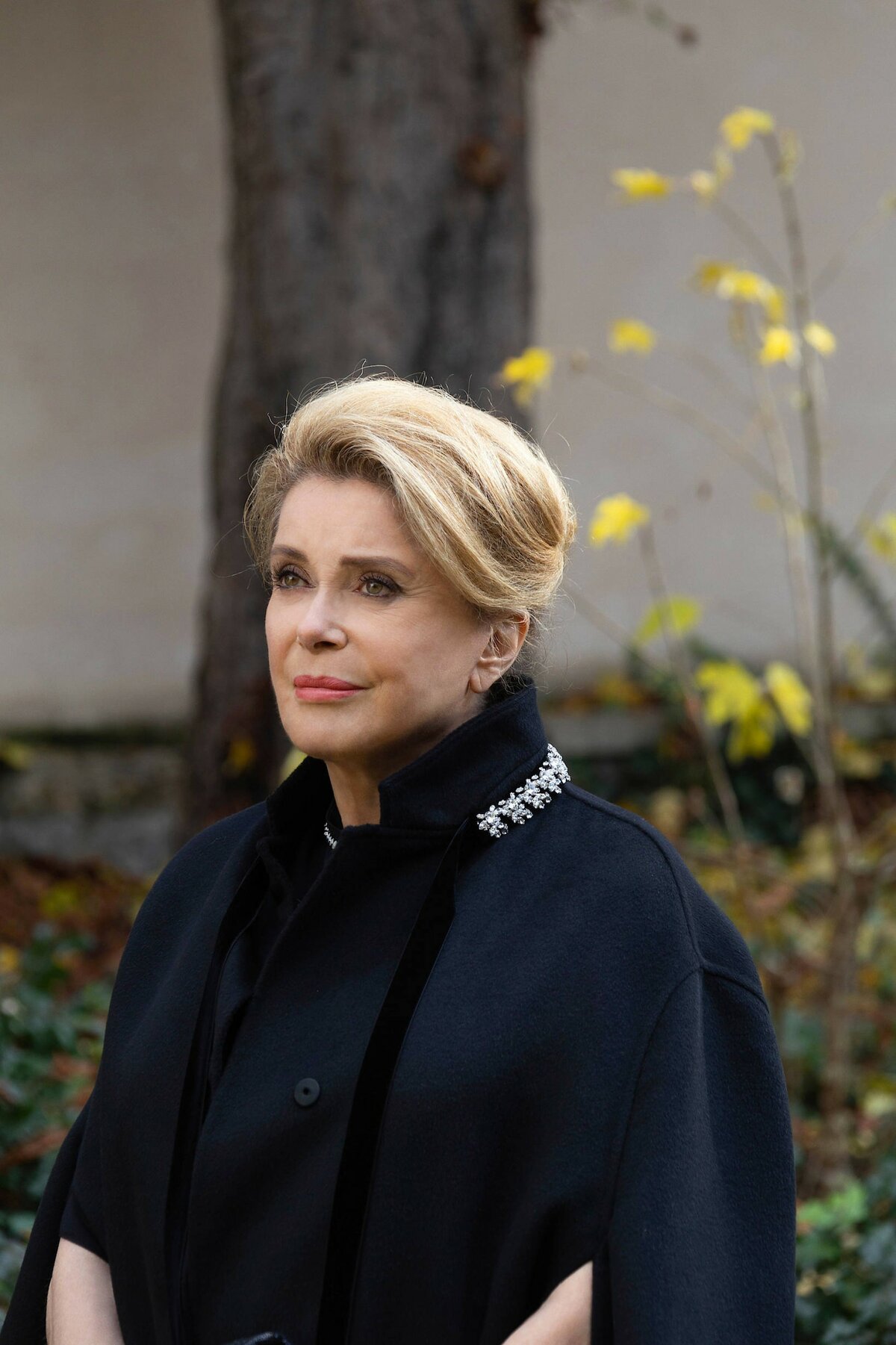 Катрин Денев, 76 лет, излучает элегантность в черном платье и шарфе с пайетками