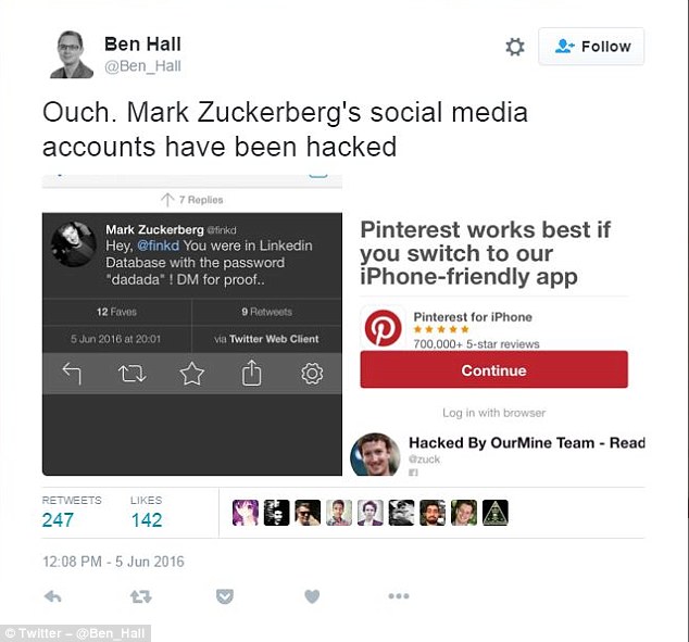 Пользователь Twitter @Ben_Hall опубликовал снимок экрана аккаунта основателя Facebook в Twitter и Pinterest, указав его пароль «dadada» и визитную карточку хакеров. Мистер Холл написал: «Ой. Аккаунты Марка Цукерберга в социальных сетях были взломаны.