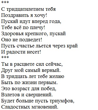 - 30-летие — это веха, которая позволяет вам чувствовать себя более уверенно в своих силах и продолжать добиваться того, чего вы хотите.Я желаю тебе, дорогой друг, чтобы твоя ценность была признана, а твоя энергия никогда не утихала!