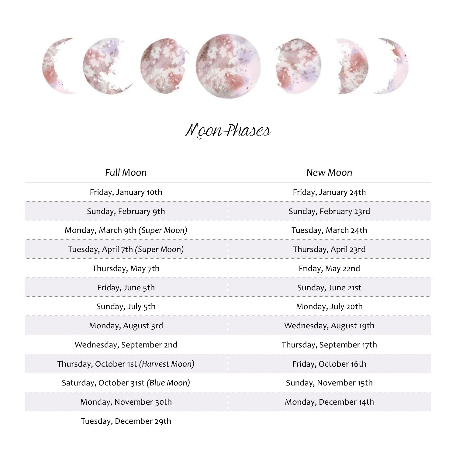 Четыре основных фазы Луны — это полнолуние, новолуние, первая четверть и последняя четверть. Между этими основными фазами есть 4 второстепенных: Растущий Полумесяц, Растущая Луна, Убывающая Луна и Убывающая Луна.Для получения дополнительной информации о лунном цикле и о каждой фазе посетите страницу Википедии «Лунная фаза».